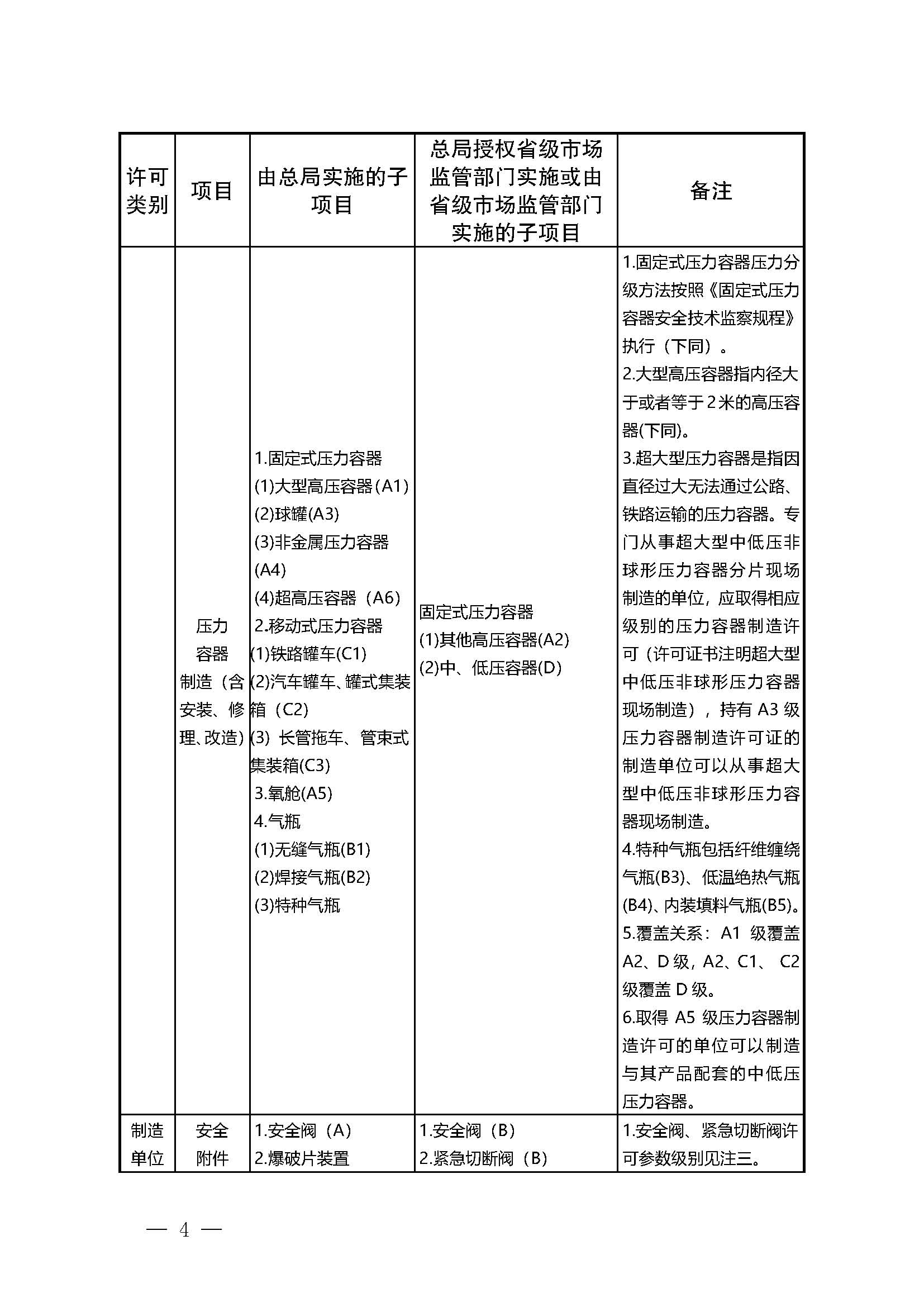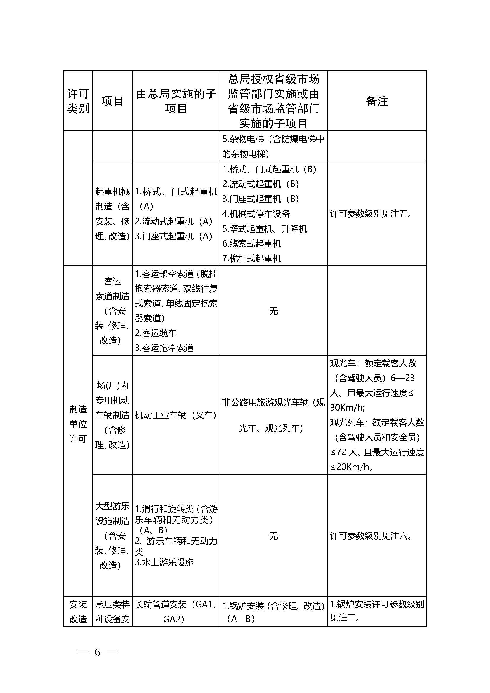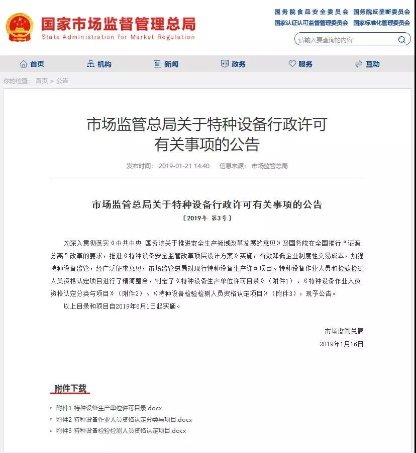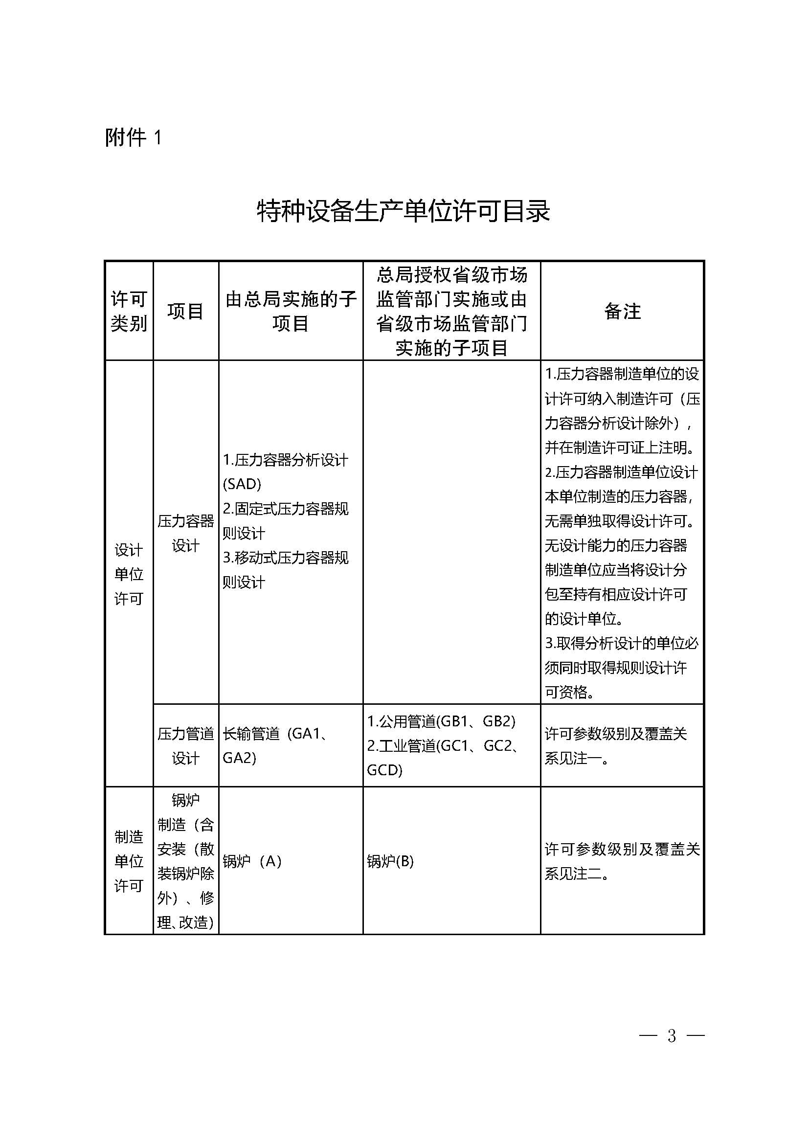 为深入贯彻落实《中共中央 国务院关于推进安全生产领域改革发展的意见》及国务院在全国推行“证照分离”改革的要求,推进《特种设备安全监管改革顶层设计方案》实施,有效降低企业制度性交易成本,加强特种设备监管,经广泛征求意见,市场监管总局对现行特种设备生产许可项目、特种设备作业人员和检验检测人员资格认定项目进行了精简整合,制定了《特种设备生产单位许可目录》(附件1)、《特种设备作业人员资格认定分类与项目》(附件2)、《特种设备检验检测人员资格认定项目》(附件3),现予公告。