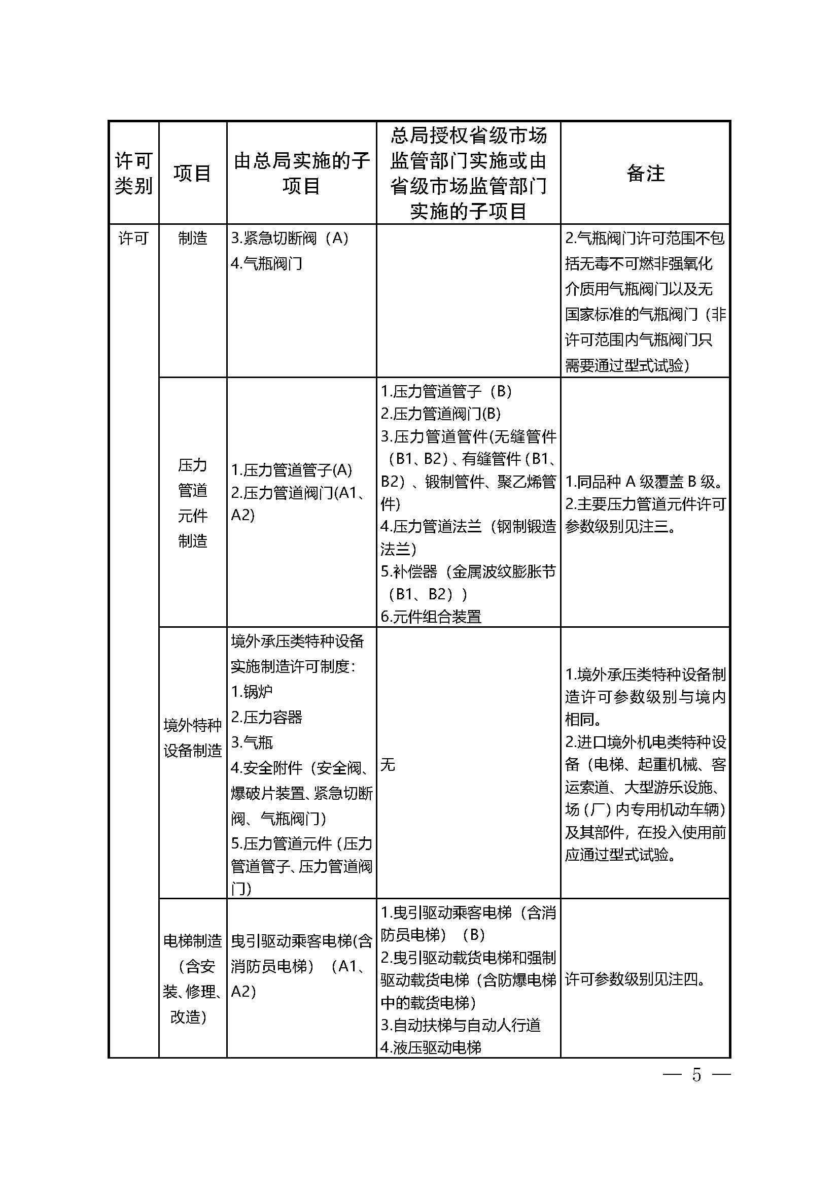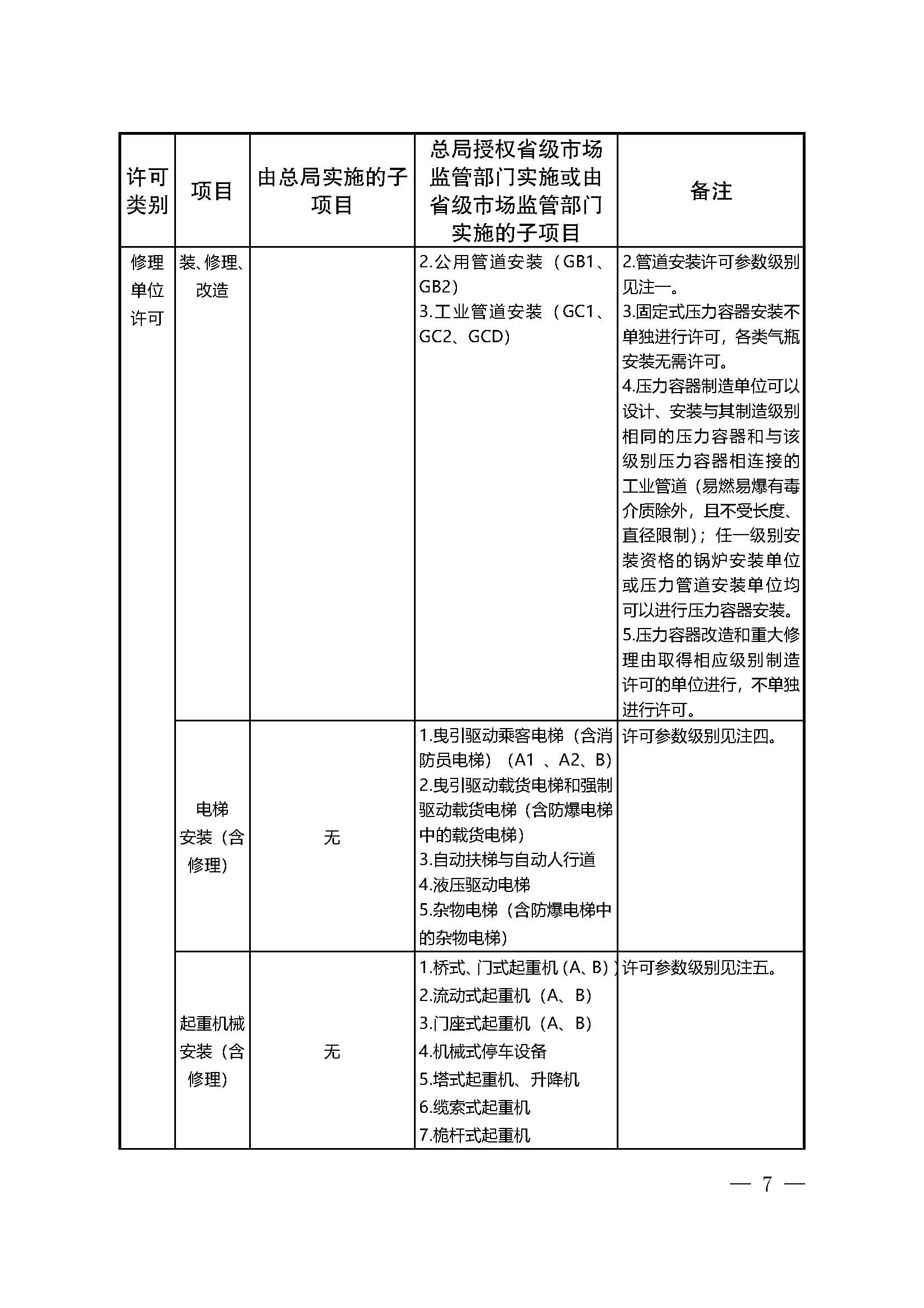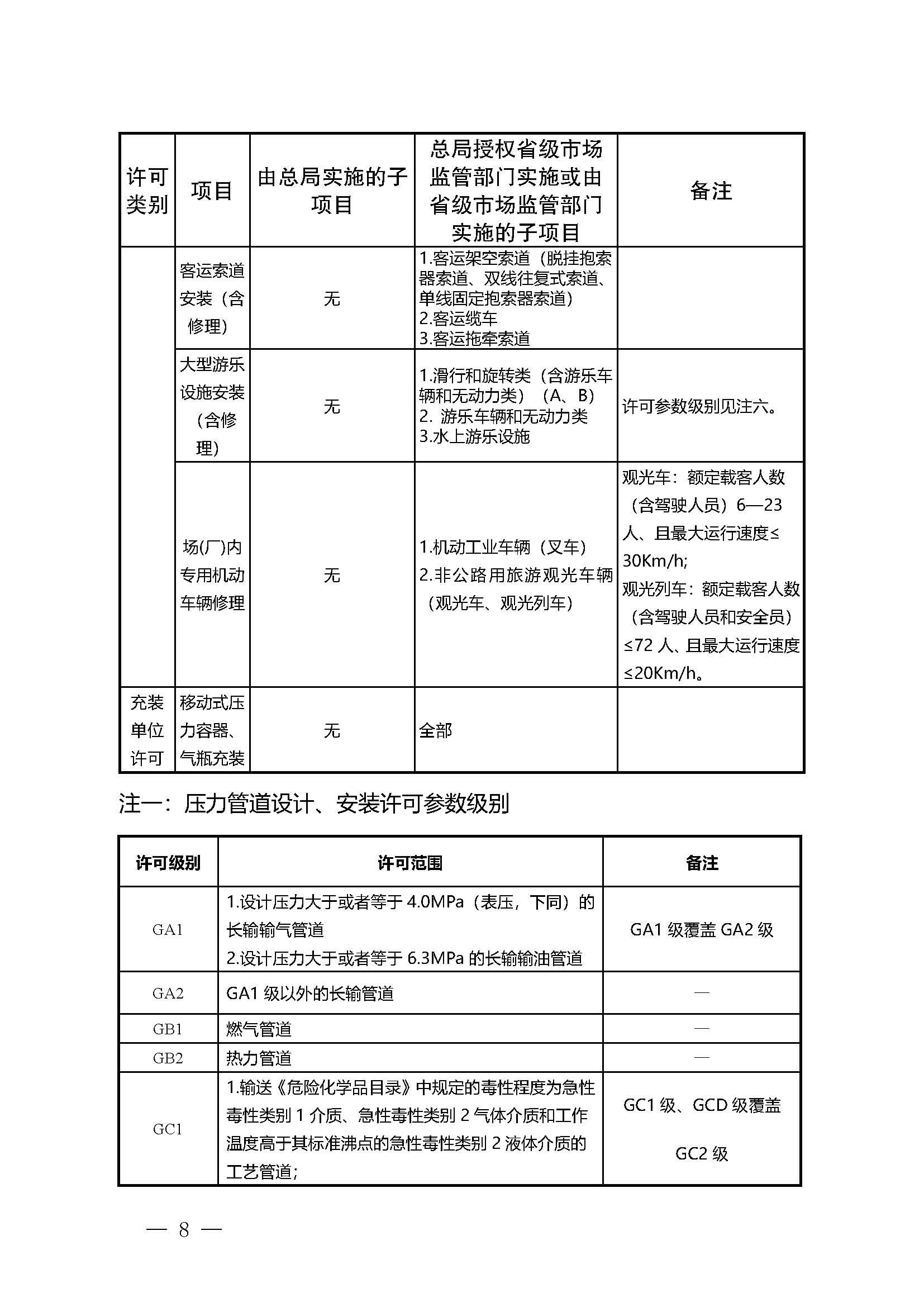 为深入贯彻落实《中共中央 国务院关于推进安全生产领域改革发展的意见》及国务院在全国推行“证照分离”改革的要求,推进《特种设备安全监管改革顶层设计方案》实施,有效降低企业制度性交易成本,加强特种设备监管,经广泛征求意见,市场监管总局对现行特种设备生产许可项目、特种设备作业人员和检验检测人员资格认定项目进行了精简整合,制定了《特种设备生产单位许可目录》(附件1)、《特种设备作业人员资格认定分类与项目》(附件2)、《特种设备检验检测人员资格认定项目》(附件3),现予公告。