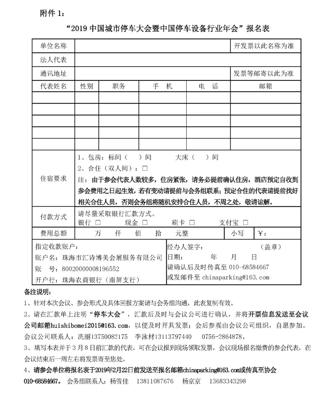 附件1:“2019中国城市停车大会暨中国停车设备行业年会”报名表