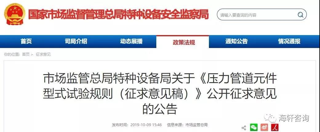 市场监管总局特种设备局关于《压力管道元件型式试验规则(征求意见稿)》公开征求意见的公告