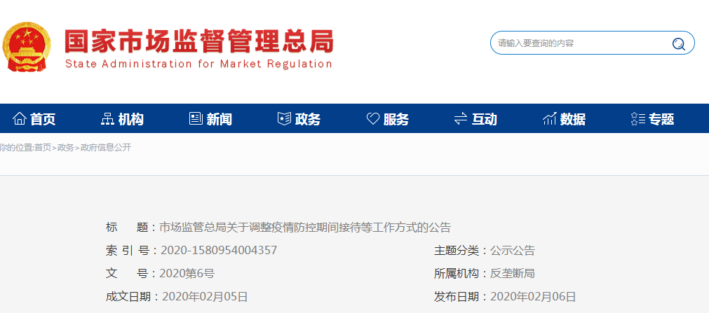 市场监管总局关于调整疫情防控期间接待等工作方式的公告
