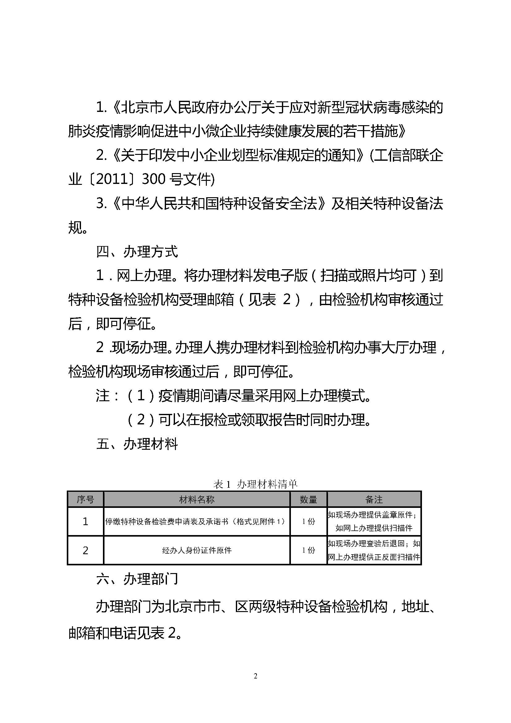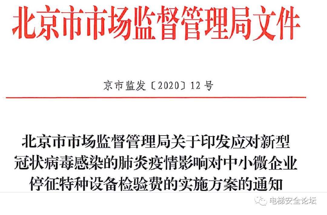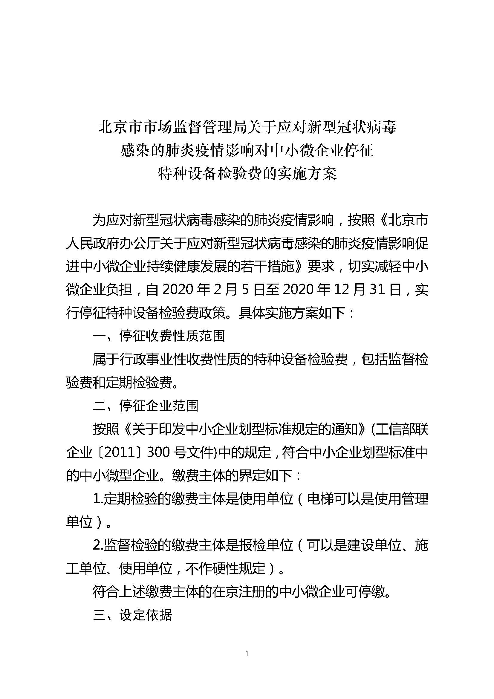 为应对新型冠状病毒感染的肺炎疫情影响,按照《北京市人民政府办公厅关于应对新型冠状病毒感染的肺炎疫情影响促进中小微企业持续健康发展的若干措施》要求,切实减轻中小微企业负担,自2020年2月5日至2020年12月31日,实行停征特种设备检验费政策。具体实施方案如下: