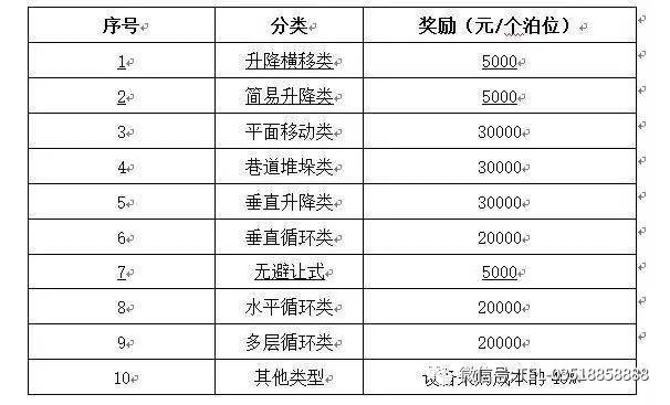 停车楼每泊位补助14000元。升降横移式机械停车库,每泊位补助5500元。垂直升降式机械停车库,每泊位补助8700元。鼓励单位、社区居民楼利用自有用地新建的对外开放的立体公共停车场,在办理完善相关手续的基础上每泊位补助5500元。