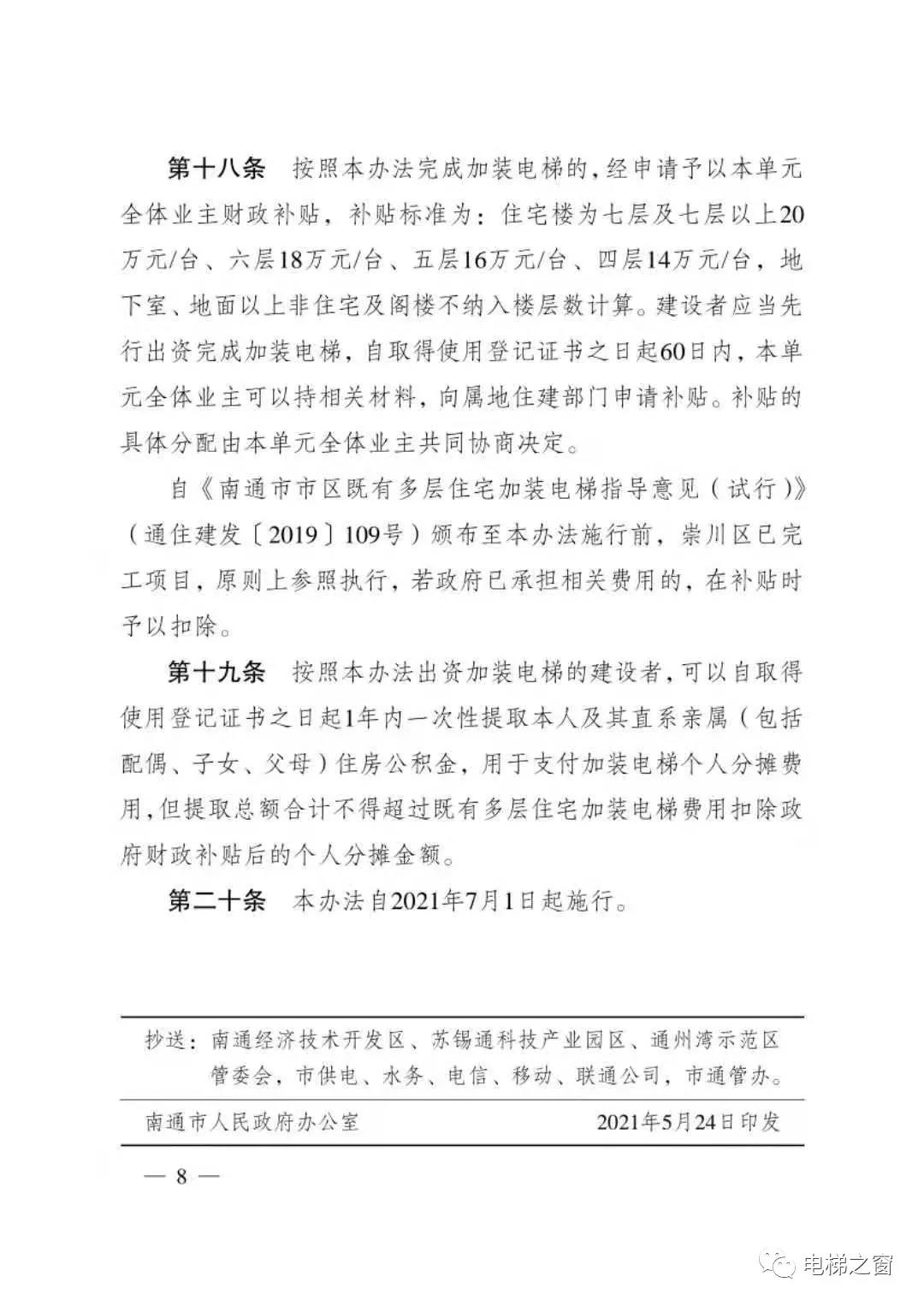 《南通市市区既有多层住宅加装电梯实施办法(试行)》将于7月1日正式实施了,财政补贴标准为:住宅楼为七层及七层以上20万元/台、六层18万元/台、五层16万元/台、四层14万元/台。